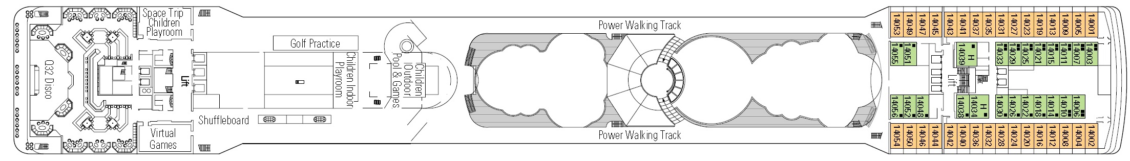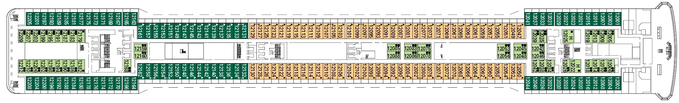 Caratteristiche: Le cabine Vista Mare Deluxe a sono cabine dispongono di letto matrimoniale convertibile in due letti singoli (su richiesta), aria condizionata, spazioso armadio, bagno con doccia, TV interattiva, telefono, accesso internet wireless (a pagamento), minibar, cassaforte. Dimensioni: 16 mq circa.